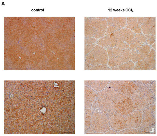 Despite the fundamental role of Glo-I in inflammation, data about Glo-I in chronic liver diseases is not available. Therefore, our group analyzed Glo-I in a CCl4-model of cirrhosis [100]. Wistar rats were treated with inhalative CCl4 three times a week to induce early cirrhosis without ascites after eight weeks, or advanced cirrhosis with ascites after 12 weeks. Furthermore, we isolated primary liver cells from cirrhotic and noncirrhotic livers via portal vein perfusion and analyzed Glo-I. Glo-I could be detected in HEP, HSC, and LSEC, with the highest expression on protein and mRNA levels in HEP. In the CCl4-model of cirrhosis, Glo-I expression was reduced in early and advanced cirrhosis in both the liver as a whole and primary liver cells (Figure 2A, Glo-I DAB-staining of whole liver sections from control animals and after 12 weeks CCl4-treatment). Furthermore, we found a consecutive increase of MGO levels in cirrhotic livers. We were also able to show that, in addition to the reduction of Glo-I, advanced cirrhosis coincided with an elevation of RAGE (Hollenbach et al., AASLD 2015, abstract ID1519). The accumulation of MGO will subsequently lead to the increased formation of AGEs. An elevated concentration of AGEs and increased expression of RAGE will in turn result in oxidative stress with perpetuating liver inflammation [100].
