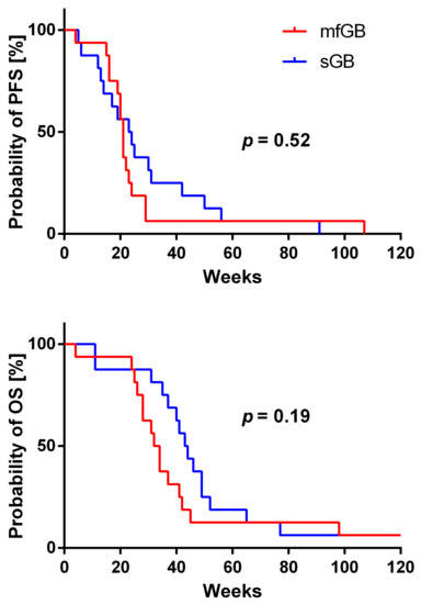 Progression-free survival (PFS) and overall survival (OS). No significant difference from patients with multifocal glioblastomas (mfGB) compared to patients with solitary glioblastomas (sGB) was observed. However, there was a clear trend for worse OS in patients with mfGB (p = 0.19).