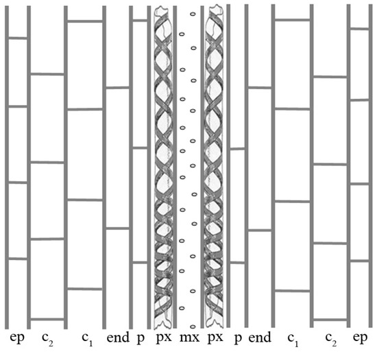 Scheme representing the primary xylem (protoxylem (px) and metaxylem (mx)) of the basal hypocotyl of 22 days after stratification (DAS) Arabidopsis thaliana dark-grown seedlings in longitudinal section. The tissues external to the xylem are indicated by the abbreviations: ep, epidermis; c1 and c2, cortical layers; end, endodermis; p, perycicle.