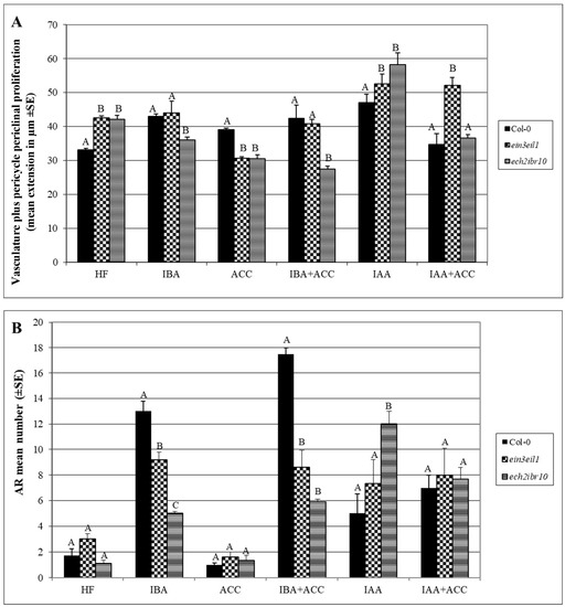 Figure 3B shows that in the basal hypocotyl of the ech2ibr10 mutant, blocked in IBA-to-IAA conversion, the formation of ARs/ARPs was similar to that of the wild type under HF or ACC treatments, whereas it became reduced with IBA treatments or enhanced with IAA. This shows the presence of an IAA-responsiveness for AR formation in this mutant, in accordance with its known IAA-sensitivity [26], and confirms the importance of an active IBA-to-IAA conversion for AR formation in Arabidopsis [16,17]. However, ACC significantly reduced (p < 0.05) the AR-response when combined with IAA in comparison with IAA alone (Figure 3B), suggesting a different action of ethylene on AR formation, depending on the exogenous auxin partner (IAA or IBA).