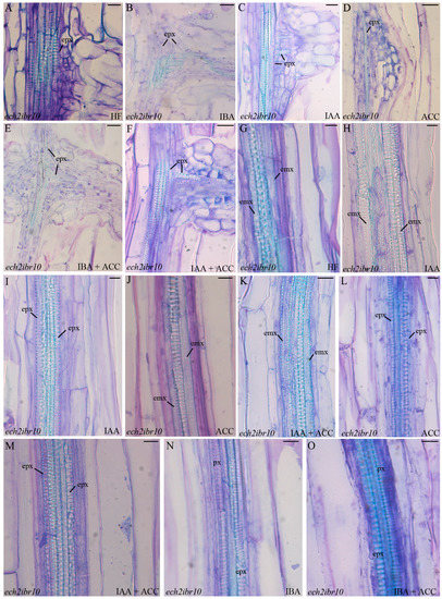 Xylogenesis and adventitious root (AR) formation in the pericycle proliferation at the base of the hypocotyl of 22 DAS ech2ibr10 seedlings grown under darkness and different hormonal conditions. (A–F) Xylary connection between the AR primordium and the hypocotyl vasculature. (G–O) ectopic xylary element formation. (A) hormone free (HF), (B) indole-3-butyric acid (IBA) at 10 μM, (C) indole-3-acetic acid (IAA) at 10 μM, (D) 1-aminocyclopropane-1-carboxylic acid (ACC) at 0.1 μM, (E) IBA (10 μM) + ACC (0.1 μM), (F) IAA (10 μM) + ACC (0.1 μM), (G) HF, (H,I) IAA (10 μM), (J,L) ACC (0.1 μM), (K,M) IAA (10 μM) + ACC (0.1 μM), (N) IBA (10 μM), (O) IBA (10 μM) + ACC (0.1 μM). emx, ectopic metaxylem; epx, ectopic protoxylem; mx, metaxylem; px, protoxylem. Longitudinal sections stained with toluidine blue. Scale bars = 10 μm (A–C,F,I,K,L,N), 20 μm (D,E,G,H,J,M,O).