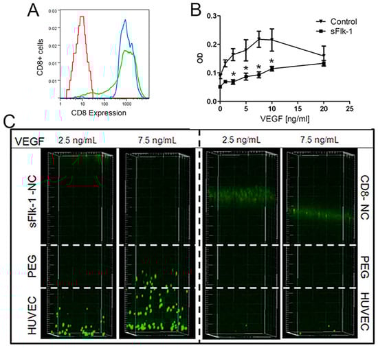 In vitro expression of CD8 and bio-activity of the sFlk-1 released by genetically modified human nasal chondrocytes. (A) Representative Fluorescence-activated cell sorting (FACS) plot shows that nasal chondrocytes (NC) had transduction efficiency above 80% (green-tinted plot) and populations of CD8-positive cells were purified after sorting (blue-tinted line). Not stained cells were acquired as control (in red). (B) Human umbilical vein endothelial cells (HUVEC) metabolic activity assay showing that sFlk-1-containing supernatants efficiently blocks Vascular Endothelial Growth Factor (VEGF). CD8-expressing NC supernatants were used as control (2 donors, n = 4). (C) HUVEC migration assay after 12 h showing that sFlk-1-expressing NC hampered HUVEC migration by blocking different gradients of VEGF, whereas CD8-only expressing NC allowed HUVEC migration. * p < 0.01.