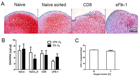 Naïve (Naïve), mock-sorted (Naïve_S), CD8a- (CD8, transduction control), and sFlk-1-CD8a-expressing (sFlk-1) cell populations were used to investigate the effect of the VEGF blockade and the transduction and sorting processes on the in vitro NC chondrocytic re-differentiation capacity (n = 3). Since hypoxic culture conditions were shown to influence in vitro cell chondrogenic capacity, the pellet culture was performed at either 2% or 20% of oxygen tension.