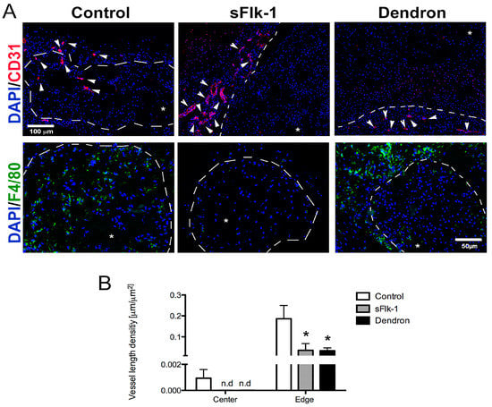 In vivo blocking of angiogenesis. (A) Representative immunofluorescence pictures of control (naïve NC), sFlk-1, and dendron-based constructs stained either in red for PECAM (CD31), an endothelial marker, (first raw, scale bar = 100 µm) or in green for F4/80, a macrophage marker (second raw, scale bar = 50 µm). Cell nuclei were stained in blue with DAPI (A). White arrows indicate the vascular structures, whereas white dotted lines mark the boundary between the implant and the surrounding host tissue. Asterisks indicate the implant area. (B) Quantification of the vessel length density in µm/µm2 at the center or edge of the implant area of naïve, sFlk-1, and dendron-based constructs (1 donor, n = 4). * p < 0.01.