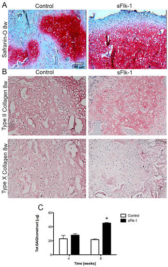 Cartilaginous extracellular matrix, detected by positive staining for Safranin-O, was formed by both control (naïve) and sFlk-1-expressing cells already after 4 weeks in vivo. Constructs generated with sFlk-1 cells contained larger Safranin-O areas (Figure 4A) as comparted to those generated by controls cells and accumulated larger amounts of GAG (Figure 4C). After 8 weeks in vivo, similarly to control samples, sFlk-1 cartilage-like constructs were positive for type II (hyaline cartilage-specific marker) and negative for type X (hypertrophic marker) collagens in the center of the implant where cartilage was formed, indicating a stable phenotype (Figure 4B).