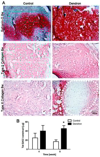 In vivo chondrogenesis of nasal chondrocytes-dendron-functionalized approach. (A) Safranin-O, types II and X collagen staining for control (naïve NC) and dendron-based constructs at 8 weeks in vivo. Dotted white line indicates the cartilaginous part of the dendron based implants. Scale bar = 50 µm. (B) Total GAG production in vivo at 4 and 8 weeks by control (naïve NC) and dendron-based constructs (1 donor, n = 5). * p < 0.01.