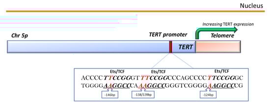 The TERT gene is located on chromosome 5p15.33 and the promoter region of this gene is considered the most important regulatory element for telomerase expression (Figure 3). The core promoter region consists of 260 base pairs with several binding sites for transcription-factor that regulate gene transcription [87]. TERT promoter mutations have been detected at a high frequency in many different cancers as melanoma, non-melanoma skin cancers, bladder cancer, and glioma. They have been related to increased TERT expression through de novo creation of binding sites for Ets/TCF transcription factors, higher telomere length, and with markers of poor outcome [86,88]. The high recurrence, specificity, and gain of function of non-coding promoter TERT mutations support that they are driver rather than passenger events in cancer development [89].