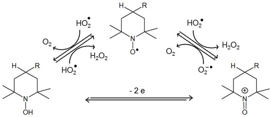 Nitroxides possess antioxidative properties owing to their ability to undergo redox cycles. They are easily reduced to hydroxylamines and oxidized to oxoammonium salts (direct conversions between hydroxylamines and oxoammonium salts are possible in two-electron reactions (Figure 2) [18].