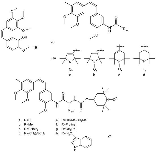 Two series of spin-labelled combretastatin derivatives were synthesised and their cytotoxic activities were tested using four tumour cell lines (K562, SGC-7901, HeLa and HepG-2). The first group of spin-labelled combretastatin derivatives contained piperidine, pyrroline and pyrrolidine residues (20 a–d), while the second group included spin-labelled combretastatin and a piperidine derivative with different substituents (21) [69].