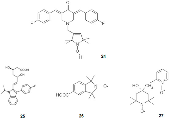Figure 8. Nitroxides and other anticancer agents: (24) HO-3867, (25) fluvastatin, (26) CTMIO and (27) Tempicol-3.
