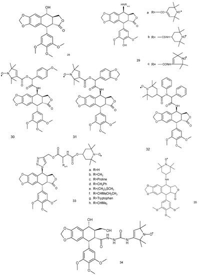Spin-labelled podophyllotoxin derivatives exhibited better antitumor activity than podophyllotoxin. Three spin-labelled podophyllotoxins analogues were tested against four human cancer cell lines (A-549, DU-145, Kb and Kbvin). Both compounds, (30 and 31), exhibited better cytotoxic activity against all cell lines in comparison to etoposide used as a reference anticancer drug. Nitroxides (30) showed a higher cytotoxic activity against Kbvin cells line than etoposide [88].