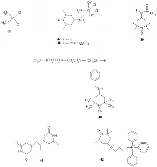 Cis-platin (36) is one of the most commonly used chemotherapeutic agents (Figure 10). It has been used for decades and currently some derivatives of cisplatin have been developed in order to reduce its toxicity to normal cells. Such an example is a complex of cis-platin and nitroxide, namely, Nx-Pt II (38), which led to cell cycle arrest and induced apoptosis in HeLa human cervical carcinoma and H1299 human lung carcinoma cell lines [91]. Some in vivo analyses performed on mice revealed that some complexes, e.g., Nx-Pt I (37), induce cancer resistance against a drug at a 2.5-fold slower rate than cis-platin. When used in combination for the treatment of leukaemia, cis-platin and Nx-Pt I (0.6 and 1.4 mg/kg of body mass, respectively) showed a synergistic effect. After 60 days of the treatment, 100% of mice were cured, while the drugs administered alone showed no effect as almost all mice were dead. In case of nitroxide-platin complex, the slower development of resistance and mentioned synergism suggested that anticancer mechanism of the complex is different from that of cis-platin alone. These complexes possess antioxidative properties that alleviate side effects, such as nephro- or neurotoxicity, which results in the higher viability of animals and efficacy of therapy [91].