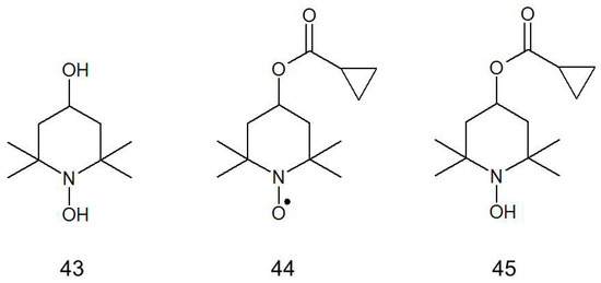 Czepas et al. (2008) [31] evaluated the potential of four nitroxides, with see Tempo, Tempol, Tempamine and Tempace (39), in reducing the toxicity induced by DOX in normal cells. These derivatives differed in substituent at position 4 of the piperidine ring. The experiments carried out on B14 immortalised hamster fibroblast cell line revealed that the most effective compound in alleviating the side effects of DOX was Tempace. Similarly, to Tempo and Tempol, it increased the viability of cells unlike Tempamine, which at higher concentrations (500–2000 μM) acted as a pro-oxidant and enhanced the toxic effect of DOX. The effect of the compounds on lipid peroxidation induced by DOX was also evaluated. Again, Tempamine was the only nitroxide that slightly increased damage to lipids, while the three other nitroxides had protective properties. EPR studies revealed that the bioreduction of nitroxides may be significant for their protective activity. The lowest rate of reduction was noted for Tempace, which was also the most efficient antioxidant to protect from DOX-induced toxicity. The least efficient Tempamine was reduced much faster. It has been confirmed that the type of substituent at position 4 of the piperidine ring is crucial for the activity of nitroxides [31]. Antioxidant properties of hydroxylamines were also confirmed; however, they were less efficient than nitroxides [89].