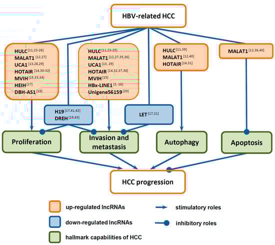 Dysregulated long non-coding RNAs (lncRNAs) in hepatitis B virus (HBV)-related hepatocellular carcinoma (HCC) and their functions in HCC progression, including the modulation of HCC cell proliferation, invasion and metastasis, autophagy, and apoptosis [,,,,,,,,,,,,,,,,,,,,,,,,,,,,,,,,].