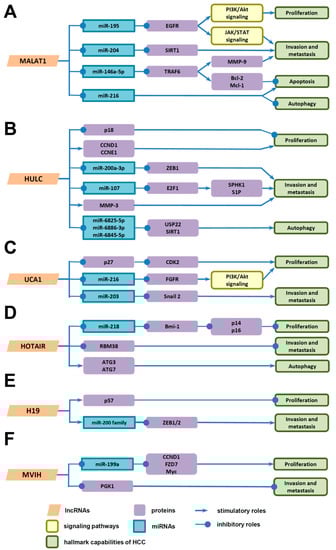 Several key lncRNAs aberrantly expressed in HBV-related HCC, their targets, and their underlying molecular mechanisms in HCC progression. (A) MALAT1 (metastasis-associated lung adenocarcinoma transcript 1); (B) HULC (highly upregulated in liver cancer); (C) UCA1 (urothelial carcinoma associated-1); (D) HOTAIR (HOX transcript antisense intergenic RNA); (E) H19 (imprinted maternally expressed untranslated mRNA); (F) MVIH (microvascular invasion in HCC).