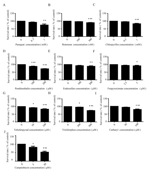Pesticides caused dose-dependent apoptotic cell death in SH-SY5Y cells. SH-SY5Y cells were treated with different concentrations of pesticides for 24 h. Cell apoptosis (A–I) was detected using annexin V-FITC/PI assay and analyzed by one-way ANOVA and Dunnett’s test (n = 4), and camptothecin (J) was the positive control. Error bars represent SEM. * p < 0.05; ** p < 0.01; *** p < 0.001.