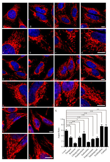 Pesticides induced morphological changes of mitochondria. HeLa cells were treated with different concentrations of pesticides or control solvent DMSO (A,a) for 24 h. Mitochondria (red) and cell nuclei (blue) are shown. High-magnification pictures (a–j) of cells are also shown to exemplify the mitochondria. Mitochondria were fragmented after exposure to 500 μM paraquat (B,b); 1 nM rotenone (C,c); 200 μM chlorpyrifos (D,d); 50 μM pendimethalin (E,e); 50 μM endosulfan (F,f); 1 μM fenpyroximate (G,g) and 20 μM tebufenpyrad (H,h). Conversely, mitochondria were elongated after exposure to 200 μM trichlorphon (I,i) and 100 μM carbaryl (J,j); bar = 10 μM. Mitochondrial aspect ratios in control or different pesticide-treated cells were measured by ImageJ and analyzed by one-way ANOVA and Dunnett’s test (K). The aspect ratios of mitochondria were analyzed by one-way ANOVA and Dunnett’s test (n = 50 cells); error bars represent SEM. * p < 0.05; ** p < 0.01; *** p < 0.001.