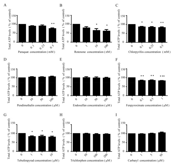 Cellular ATP levels in SH-SY5Y cells exposed to pesticides were determined using the CellTiter-GloH Luminescent Cell Viability Assay Kit (Promega, Madison, WI, USA, G7570). In brief, cells were grown in 24-well fluorimeter plates and exposed to various concentrations of the pesticides. Following removal of media, cells were washed with cold PBS and then ATP levels were determined as described in the manufacturer’s protocol. Then, the determined ATP levels were normalized by total protein concentration. Each experiment was repeated three times.