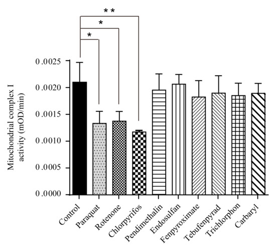NADH dehydrogenase is the first enzyme (complex I) of the mitochondrial electron transport chain, which translocate four protons across the inner membrane per molecule of oxidized NADH, helping to build the electrochemical potential used to produce ATP. As paraquat, rotenone, chlorpyrifos, fenpyroximate and tebufenpyrad caused a significant dose-dependent decrease of intracellular ATP, we examined their effect on NADH dehydrogenase activity. The results showed that NADH dehydrogenase activity was decreased in paraquat- (0.5 mM), rotenone- (100 nM) and chlorpyrifos (500 μM)-treated cells as compared to controls (Figure 4). It is known that chlorpyrifos causes oxidative stress and neurotoxicity in humans and animals [38,39], which may be attributed to the activity disorder of NADH dehydrogenase. Dichlorvos, another organophosphate, caused the same effect through the same mechanism [40]. Paraquat and rotenone are classical complex I inhibitors [24,41]. On the other hand, trichlorphon (200 μM), carbaryl (100 μM), fenpyroximate (2.5 μM), pendimethalin (50 μM), endosulfan (50 μM) and tebufenpyrad (50 μM) had no significant influence on NADH dehydrogenase activity (Figure 4).