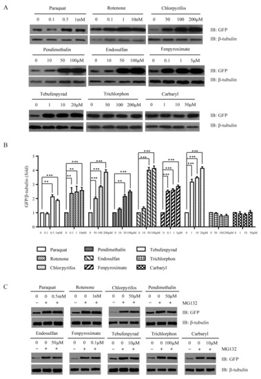 All present-study pesticides except trichlorphon and carbaryl inhibited 26S proteasome activity. SH-SY5Y cells stably expressing GFPU were exposed to low concentrations of pesticides for 24 h, and GFP expression levels were detected by immunoblotting (A); relative levels of GFP were measured by ImageJ and analyzed by one-way ANOVA and Dunnett’s test (n = 4) (B); error bars represent SEM. * p < 0.05; ** p < 0.01; *** p < 0.001. β-tubulin was detected as a loading control. (C) SH-SY5Y cells stably expressing GFPU were exposed to pesticides (500 μM paraquat, 1 nM rotenone, 50 μM chlorpyrifos, 50 μM pendimethalin, 50 μM endosulfan, 0.1 μM fenpyroximate, 10 μM tebufenpyrad, 100 μM trichlorphon, 10 μM carbaryl) with 0.1 μM MG132 for 24 h, and GFP expression levels were detected by immunoblotting.