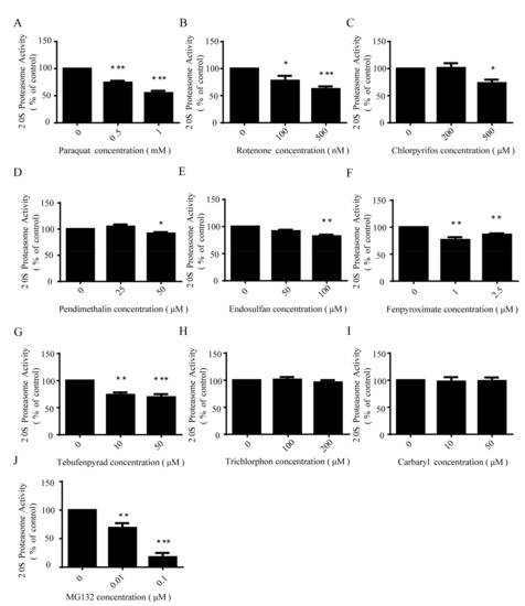 All present-study pesticides except trichlorphon and carbaryl inhibited 20S proteasome activity. SH-SY5Y cells were exposed to low concentrations of paraquat (A); rotenone (B); chlorpyrifos (C); pendimethalin (D); endosulfan (E); fenpyroximate (F); tebufenpyrad (G); trichlorphon (H); and carbaryl (I) for 24 h; MG132 (J) was the positive control. The 20S proteasome activity was measured with addition of substrate LLVY-AMC and analyzed by one-way ANOVA and Dunnett’s test (n = 5). Error bars represent SEM. * p < 0.05; ** p < 0.01; *** p < 0.001.