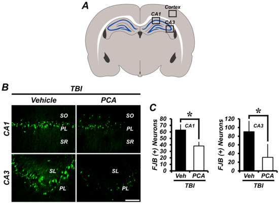 Protocatechuic acid (PCA) reduces the number of degenerating neurons after traumatic brain injury (TBI). Neuronal death was examined by Fluoro-Jade B (FJB) staining. Thus, FJB positive neurons were not detected in the sham-operated groups. (A) A schematic drawing indicates quantified area in the hippocampus and cerebral cortex. (B,D) Fluorescence images represent the relative degree of neuronal death in the hippocampus (B) and cortex (D) at 24 h after TBI. PCA administration reduced the number of FJB (+) neurons in the hippocampus and cortex when compared to the vehicle-treated group. Scale bar = 100 µm. (C,E) The bar graph shows the number of degenerating neurons in the hippocampus (C) and cortex (E). Data are mean ± SEM, and n = 10 from each TBI group. * Significantly different from vehicle-treated group, p < 0.05. Veh = Vehicle; SR = Stratum Radiatum; PL = Pyramidal Layer; SO = Stratum Oriens of hippocampus cornu ammonis 1 (CA1) and CA3 area.