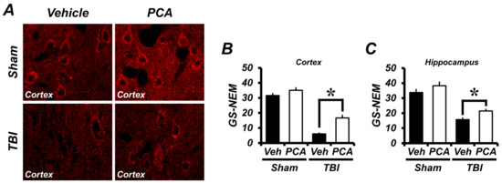 To evaluate the changes to GSH content in the hippocampal pyramidal neurons, brain sections were stained with glutathione adduct with N-ethylmaleimide (GS-NEM). Levels of GSH fluorescence in the hippocampal neurons and cortical neurons were analyzed using ImageJ. GSH concentrations in the hippocampus and cortex were significantly decreased by TBI. However, GSH concentrations in the hippocampal and cortical neurons were 146% to 360% higher, respectively, in the PCA-treated group when compared to the vehicle-treated group after TBI (Figure 3).
