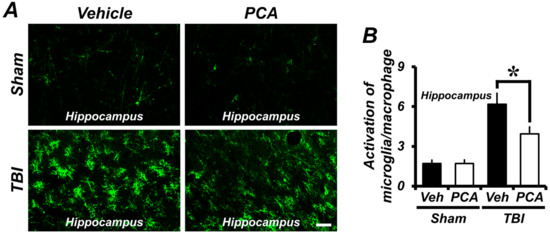 2.5. PCA Decreases TBI-Induced Microglial and Macrophage Activation