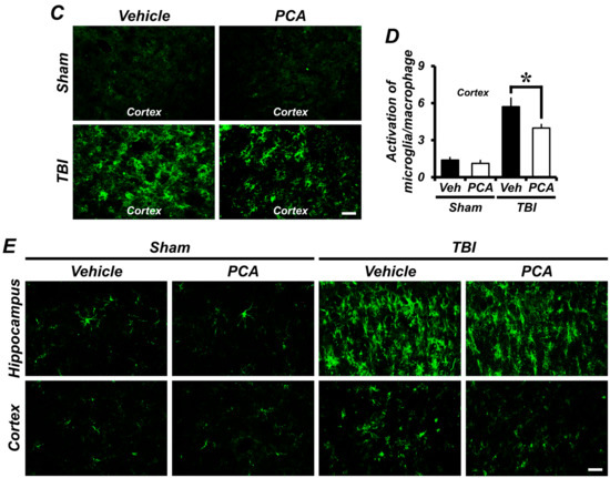 PCA reduces TBI-induced microglia and macrophage activation. (A,C) Representative images showed CD11b immunoreactive cells in the hippocampus (A) and cortex (C). The activation of CD11b-positive microglia and macrophage occurred at one week after TBI. PCA administration reduced the activation of CD11b-positive microglia and macrophage in the hippocampus, compared to the vehicle-treated group. Scale bar = 20 µm. (B,D) The bar graphs represent the grade of CD11b-positive microglia/macrophage activation in the hippocampus (B) and cortex (D). Data are mean ± SEM, n = 5 from each sham group and n = 10 from each TBI group. * Significantly different from vehicle-treated group, p < 0.05. (E) Fluorescence photomicrographs represented Iba1 immunoreactive cells in the hippocampus and cortex. Sham-operated groups showed the resting state of Iba1-positive microglia and macrophage. There was no difference in the Iba1 immunoreactivity (IR) between vehicle- and PCA-treated group. However, TBI caused significant increase of Iba1 IR in the hippocampus and cortex. PCA treatment reduced the activation of Ionized calcium binding adaptor molecule 1 (Iba1)-positive microglia and macrophage after TBI, compared to the vehicle-treated group.