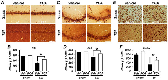 To test whether PCA had neuroprotective effects, NeuN staining was performed at one week after TBI. As estimated in Figure 5, the number of NeuN (+) neurons in the vehicle-treated TBI group was decreased by 50%, 29%, and 63% from the CA1, CA3, and cortex, respectively, when compared to the vehicle-treated sham group. However, the number of NeuN (+) neurons in the PCA-treated TBI group was significantly increased by 24%, 37%, and 48%, when compared to the TBI-vehicle treated group in the CA1, CA3, and the cortex, respectively. These results suggested that TBI-induced delayed neuronal loss was prevented by PCA treatment (Figure 5).