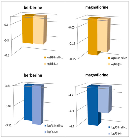 The logPS and logBB values calculated from the newly constructed Models (1)–(4) for berberine and magnoflorine have been compared with the predicted proper values predicted in silico (Figure 1). The values obtained from the newly formed models have been found to be very close to those predicted in silico. This can indicate that the newly formed models are relevant for description of BBB permeability of the studied compounds. The best fit was obtained for Model (1) based on the Abraham parameters.