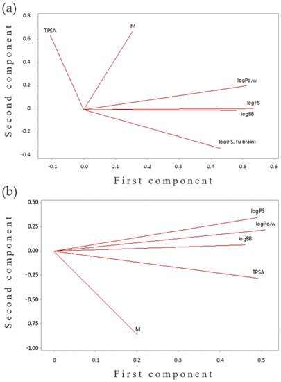 To confirm these assumptions, principal components analysis (PCA) was conducted (Minitab 17 software). The results of PCA were obtained using in silico calculated logBB, logPS, logPS*fu,brain, logPo/w, molar mass, and TPSA values. The first two principal components explain more than 87% of the variance in the data in both the aporphines and protoberberines groups. In Figure 2, loading plots of the above-mentioned parameters are presented. As we can see from the loading plot corresponding to the first two principal components, there is a correlation between the BBB parameters and logPo/w values for aporphines and between the BBB parameters and all the tested physicochemical descriptors for protoberberines. Therefore, the previous correlations between the BBB descriptors and the chosen molecular parameters were proven. Thereby, the initial in silico BBB studies as well as the newly constructed model and the PCA analysis indicated the ability of both berberine and magnoflorine to cross the BBB.