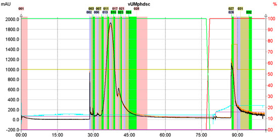 As a consequence, the optimized purification protocol resulted in the collection of magnoflorine from the eluate quickly—in the 35th minute, a purity of 91% directly from the crude extract was obtained (see Figure 3).