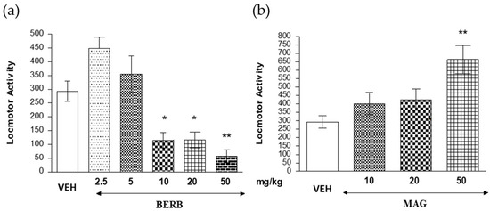 Effects of berberine (BERB) (a) and magnoflorine (MAG) (b) on the locomotor activity. The data are shown as the means ± standard error of the mean (SEM), photocell beam breaks of mice measured immediately after injection for 60 min; n = 9; * p < 0.05; ** p < 0.01 vs. vehicle (VEH)-treated control group; Tukey’s test.