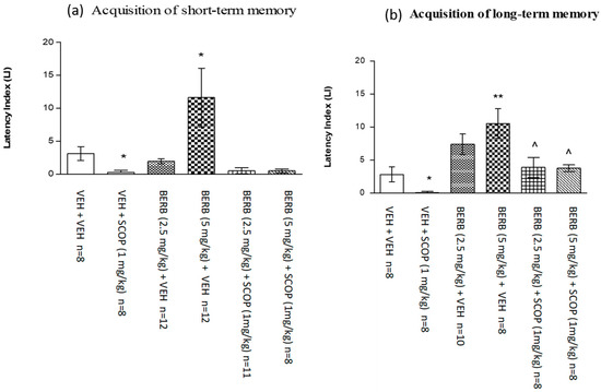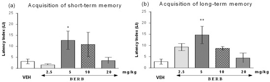 Indeed, treatment with berberine at the dose of 5 mg/kg significantly increased LI values in the PA test in mice compared with those in the vehicle-treated control group (p < 0.05, a post-hoc Tukey’s test—for short-term memory acquisition (Figure 5a) and p < 0.01, a post-hoc Tukey’s test, for long-term memory acquisition (Figure 5b), indicating that berberine, at the used dosage, improves the short-term as well as long-term acquisition of memory and learning.