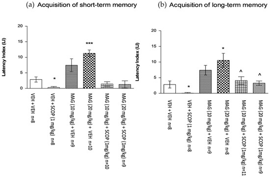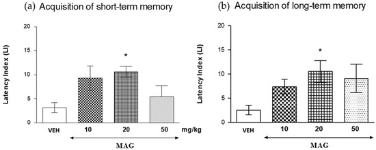 Indeed, treatment with magnoflorine at the dose of 20 mg/kg significantly increased LI values in the PA test in mice compared with those in the vehicle-treated control group (p < 0.05, a post-hoc Tukey’s test—for short-term memory acquisition (Figure 6a) and for long-term memory acquisition (Figure 6b), indicating that magnoflorine at this used dose, improves the short-term as well as long-term acquisition of memory and learning.