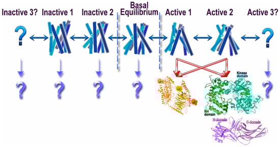 Conformational heterogeneity of G protein-coupled receptors (GPCRs) and signaling. Unliganded GPCRs appear to exist in the equilibrium between multiple conformations (basal equilibrium), which the agonists partially shift towards active conformations []. It is likely that there are several “active” conformations of GPCRs (shown as Active 1, 2, and 3). The most realistic scenario is that the great majority of active conformations effectively couple to G proteins, GRKs, and arrestins. However, there likely are some that might preferentially engage distinct signal transducers, such as different G proteins, GRKs, and/or arrestins (this phenomenon is called biased signaling). While the idea that the receptor conformations preferred by G proteins and GRKs/arrestins do not fully overlap appears attractive, we do not have direct structural evidence to support it. Similarly, another idea that phosphates in different positions on the cytoplasmic GPCR elements encode distinct conformations of bound arrestins and therefore functional outcomes [,] is enticing, but it also awaits supporting structural evidence. The binding of presumably inactivating inverse agonists also does not shift the equilibrium to a single conformation, suggesting that there might be multiple different inactive states (shown as Inactive 1, 2, and 3). Whether any of these conformations facilitate the engagement of distinct interaction partners remains to be elucidated (shown as “?”).