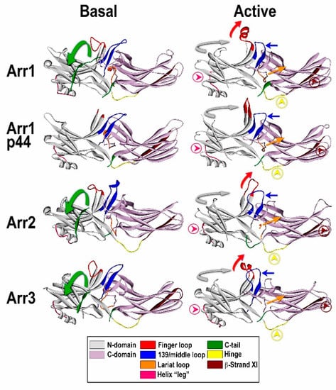 Comparison of the basal and “active” conformations of arrestin proteins. Crystal structures of arrestin-1 (Arr1) (PDB ID 1CF1) (left) [] and 4ZWJ (right) [], arrestin-2 (Arr2) (PDB ID 1G4M) (left) [] and 4JQI (right) [], short splice variant of arrestin-1, p44 (PDB ID 3UGU) (left) [] and 4J2Q (right) [], and arrestin-3 (PDB ID 3P2D) (left) [] and (PDB ID 5TV1) (right) []. The elements with different conformations in active and inactive arrestins are shown, as follows: the C-tail, green (moves out of its basal position in the cavity of the N-domain in the process of receptor binding; absent in p44); inter-domain hinge, light blue (has essentially the same conformation in all activated arrestin structures, in contrast to a wide range of conformations in the basal state); β-strand XI, dark blue (it is register shifted by one residue in arrestin-2 and -3, which “flips” it by 180 degrees, and by two residues in arrestin-1 and p44, which moves it relative to the other parts of the molecule but does not change the exposed side chains); finger loop, red (moves towards the receptor, the tip becomes α-helical); 139-loop (also known as middle loop), violet (moves towards the N-domain); lariat loop extension, magenta (moves lariat loop towards the N-domain, out of its basal position, which removes two out of three negative charges from the polar core); the connector of the α-helix in the N-domain, pink. The twist of the two domains relative to each other (N-domain, teal; C-domain, gray) by 17–20 degrees is indicated by arrows.
