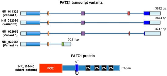 The POZ/BTB and AT-hook-containing Zinc finger protein 1 (PATZ1), also known as MAZ Related factor (MAZR), Zinc finger Sarcoma Gene (ZSG) or Zinc finger Nuclear Factor/Zinc finger protein 278 (ZNF278/Zfp278), is a transcriptional regulatory factor that has been shown to modulate the expression of different genes either negatively or positively depending on the cellular context [1]. It was first discovered by our group as an interacting protein with the RING finger Nuclear Factor 4 (RNF4) with which it cooperates in gene transcriptional regulation [2]. At the same time, two other laboratories came across the study of this gene while looking for proteins interacting with the B-cell and neuron-specific transcription repressor Bach2, a CNC-related bZip factor [3] and studying an intra-chromosomal rearrangement of chromosome 22 occurring in small round cell sarcoma, in which part of the new ZSG gene was found fused to the Ewing Sarcoma gene (EWS) causing loss of function of ZSG and gain of function of EWS [4]. The PATZ1 gene, which maps on human chromosome 22q12, includes six exons and gives rise to four splicing transcript variants ranging from 3021 bp (short isoform) to 3812 bp (Long C isoform) (GenBank accession numbers: NM_014323; NM_032050; NM_032052; NM_032051) coding for four protein isoforms ranging from 537 aa (NP_114440; NP_114441) to 641 aa (NP_114439) and 687 aa (NP_055138) [4] (Figure 1). Structurally, all protein variants are characterized by a Poxvirus and Zinc-finger (POZ)/Broad complex, Tramtrack, and Bric à Brac (BTB) domain at the N-terminus, an AT hook DNA binding motif before the first zinc finger, and a cluster of classical Cys2-His2 zinc fingers (four to six depending on the splicing variant) at the C-terminus [4]. The latter reiterated motif, which presents two conserved cysteine and histidine residue pairs linked to a single zinc ion, is a well known and conserved DNA/RNA binding domain that acts linearly in tandem to allow recognition of nucleic acid sequences of varying length [5]. For this modular organization PATZ1 has been included in a large family of transcription factors, named POZ-ZF or POK, including BCL6, PLZF, TAZ1, and others [6,7], in which the POZ/BTB domain mediates protein-protein interactions, allowing the recruitment of histone deacetylases through co-repressor complexes [7]. Unique in this family of transcription factors is the presence in the PATZ1 protein of an AT-hook, another DNA binding motif that binds DNA through the minor groove, usually cooperating with other DNA binding protein complexes, to play key roles in chromatin-remodeling and transcription regulation [8].