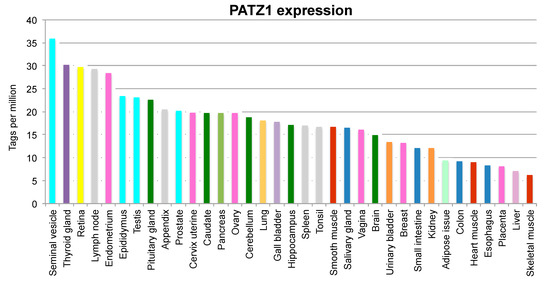 PATZ1 expression in human tissues. mRNA levels of PATZ1 in a panel of human tissues, obtained through Cap Analysis of Gene Expression (CAGE) by the FANTOM5 project [22]. The data have been extracted from the Human Protein Atlas [23]. PATZ1 is expressed at variable levels in all tissues.