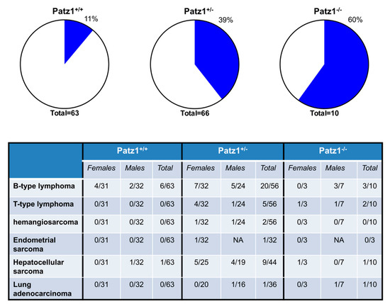Malignant tumors in PATZ1 knockout mice. Percentage of mice showing malignant tumors are showed in pie charts on the top. The specific tumor phenotype, and relative number of mice showing it, is reported in the table. The mice analyzed were wild-type (Patz1+/+) and carrying one (Patz1+/−) or two (Patz1−/−) knockout allele. NA = not applicable.