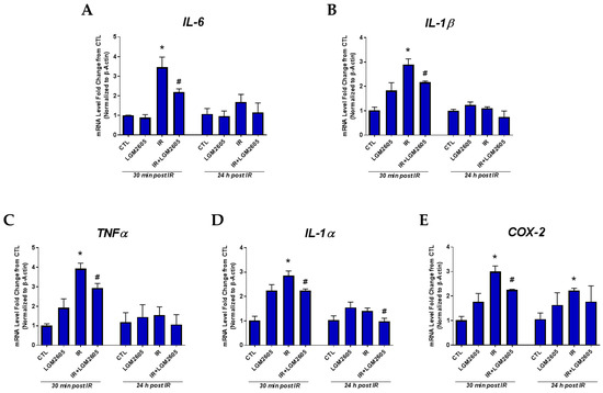 The acute inflammatory response to proton radiation exposure of lung tissue (huPCLS) was further characterized by determining the mRNA levels of proinflammatory cytokines (IL-1β, IL-6, TNFα, and IL-1α) and cyclooxygenase-2 (COX-2), an enzyme responsible for the formation of pro-inflammatory moieties [18]. The transcript levels of inflammatory markers, IL-1β, IL-6, TNFα, and IL-1α, and COX-2 in huPCLS were monitored at 30 min and 24 h post 4 Gy proton radiation with or without LGM2605 pretreatment for 4 h and are shown in Figure 1A–E. LGM2605 pretreatment significantly dampened the proton radiation-induced inflammation in huPCLS (36.7% reduction for IL-6 and 25.1% reduction for IL-1β) and significantly (p < 0.05) decreased the induction of COX-2 by 25.0% when evaluated 30 min post radiation exposure.