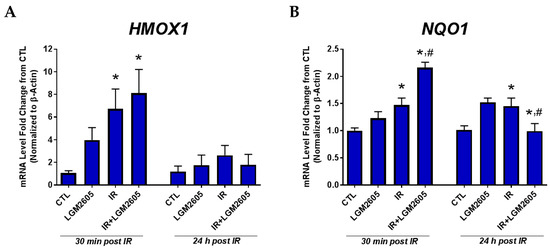 Figure 2 depicts the expression of antioxidant genes HMOX1 and NQO1 in huPCLS after 30 min and 24 h post 4 Gy proton radiation with or without LGM2605 pretreatment for 4 h. At 30 min post radiation, mRNA levels of the antioxidant gene NQO1 among proton-exposed huPCLS show a significant (p < 0.05) increase over non-irradiated samples (1.47 ± 0.13-fold increase), which was further significantly boosted by the action of LGM2605 (2.16 ± 0.10-fold increase). The effects of both the radiation exposure and the test article were less profound by 24 h post exposure.