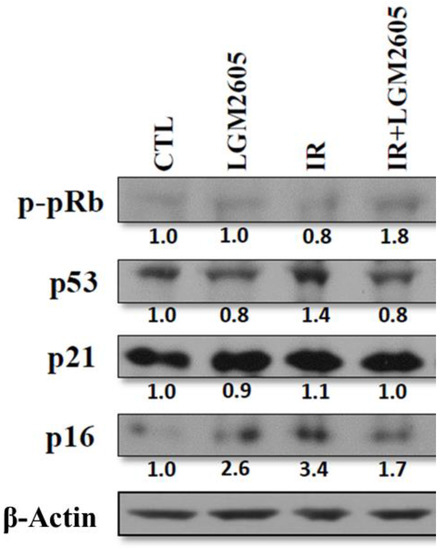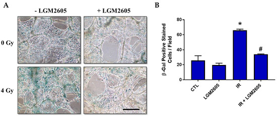 Exposure of cancer cells to ionizing radiation induces cellular senescence, thus inhibiting tumor growth and progression [22]. Specifically, modulating radiation-induced senescence of non-small cell lung cancer cells has been investigated as a mechanism of overcoming radioresistance [23,24]. As a confirmation that LGM2605 pretreatment does not impair the tumoricidal effect of proton radiation exposure, A549 human lung adenocarcinoma cells were exposed to 4 Gy proton radiation and evaluated for radiation-induced cellular senescence by staining for senescence-associated β-galactosidase.