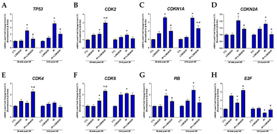 Next, we evaluated cellular senescence in huPCLS by staining for senescence-associated β-galactosidase. As shown in Figure 3, exposure to 4 Gy proton radiation significantly (p < 0.05) increased senescence-associated β-galactosidase (SA-β-gal) staining (blue staining in Figure 3A), which was significantly reduced by LGM2605 pretreatment to levels comparable to non-irradiated huPCLS. After observing such a robust improvement in proton radiation-induced cellular senescence with LGM2605 pretreatment, we next evaluated molecular biomarkers of cellular senescence both at the message (gene) and the induced protein level. The oncosuppressor gene TP53 orchestrates the transcriptional response that culminates in senescence and cell death [19]; the protein TP53 that is induced gets stabilized (via post translational modifications) in response to damage/radiation. TP53 can activate cell cycle-arresting genes like cyclin-dependent kinase (CDKN1A) [20]. The CDK family of proteins drives the cell cycle by phosphorylating various substrates involved in cell growth and differentiation. CDK4/6 and CDK2 inactivate the retinoblastoma tumor suppressor protein (pRb), which is a “gatekeeper” of the G1-S phase transition. Another member of the CDK family is the CDKN2A gene that encodes different transcripts involved mostly in cell cycle regulation and cellular senescence such as the tumor suppressor proteins p16 and p19. Figure 4 and Figure 5 show proton radiation-induced increases in the mRNA and protein levels of TP53, as well as CDKN2A (p16), and that this increase, which is an index of increased senescence, is significantly (p < 0.05) abrogated by LGM2605 pretreatment. Additionally, phosphorylation of pRb was boosted by as much as 80% by LGM2605 as compared to untreated irradiated lung slices, in which expression was decreased by 20% from respective non-irradiated controls. This reversal of the hypophosphorylated state of pRb is associated with inhibition of cellular senescence [21]. CDK2, CDK4, and CDK6, which trigger the G1/S phase and thus drive cell proliferation, are significantly (p < 0.05) elevated among huPCLS pretreated with LGM2605 and exposed to proton radiation compared to huPCLS, which is exposed to proton radiation alone.