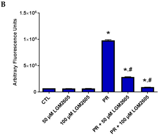Having observed an increase in the mRNA levels of proinflammatory cytokines, such as IL-1β and IL-6, following 4 Gy proton radiation exposure, we proceeded to further investigate the proinflammatory phenotype induced by proton radiation by evaluating the expression of intercellular adhesion molecule-1 (ICAM-1) in huPCLS following radiation. As shown in Figure 8, ICAM-1 expression is increased in huPCLS at 24 h post radiation exposure, noted by the increase in green fluorescence (Figure 8A). LGM2605 pretreatment led to a dose-dependent decrease of proton radiation-induced ICAM-1 expression (50 µM LGM2605 pretreatment led to an 87% reduction in proton radiation-induced ICAM-1 expression and 100 µM LGM2605 pretreatment led to a 96% reduction in proton radiation-induced ICAM-1 expression) (Figure 8B).