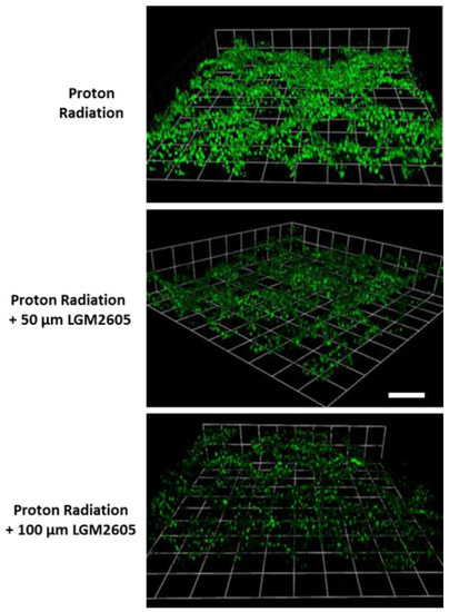 As shown in Figure 6, increase in green fluorescence that arises from the oxidation of the fluorogenic probe that represents cellular oxidative stress implies proton radiation-induced oxidative stress in huPCLS. This cell-permeant dye is non-fluorescent while in a reduced state, and exhibits bright fluorescence in the presence of reactive oxygen species (ROS) or oxidized lipids. LGM2605 at both 50 and 100 µM reduced CellROX Green fluorescence, implying that oxidative stress induced by proton radiation can be significantly reduced by this agent. Figure 7 indicates a 3D image of the irradiated huPCLS, depicting that oxidative damage from proton exposure is full-thickness (i.e., though the entire 300–350 μM lung section) and protection by LGM2605, although added to the medium, i.e., externally, extends through the entire thickness of the exposed tissue.