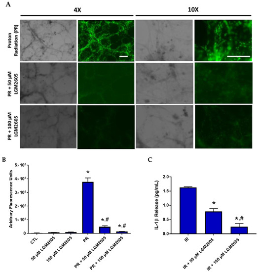 The observed decrease in ICAM-1-induced expression following proton radiation exposure prompted us to look at the release of a key inflammatory cytokine, IL-1β, by proton-irradiated huPCLS. As shown in Figure 8C, LGM2605 pretreatment significantly (p < 0.05) reduced IL-1β release by 52% (50 µM LGM2605) and 85% (100 µM LGM2605).