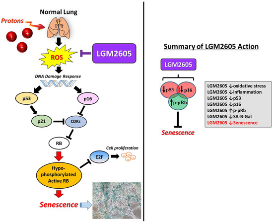 Schematic representation of LGM2605’s blockade of senescence markers induced by proton radiation of normal lung tissue/cell. Arrow-headed lines indicate activation and bar-headed lines indicate inhibition. ROS, Reactive oxygen species; CDK, cyclin-dependent kinase; RB, retinoblastoma; E2F, E2 factor.