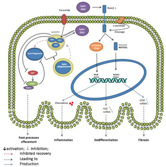 Potential mechanism of action of Globotriaosylceramide (Gb3) and Globotriaosylsphingosine (Lyso-Gb3) in Fabry’s disease podocyte. The accumulation of Gb3 in lysosomes inhibits AKT and mTOR pathway leading to the dysregulation of autophagy signaling in the podocyte. The inhibition of mTOR prevents the recovery of autophagosomes and lysosomes from autophagolysosomes by negative regulation. The formation of the autophagolysosomes causes podocyte foot processes effacement thus injury. Lyso-Gb3, the deacetylated form of Gb3, also plays a role in podocyte injury by promoting inflammation, fibrosis and dedifferentiation of podocytes. Lyso-Gb3 activates both the NOTCH signaling pathway, through γ-secretase, and nuclear factor κB (NFκB) leading to the release of chemokines. NOTCH-1 activation also promotes the transcription of HES genes and genes coding for extracellular matrix (ECM) proteins thus inducing, respectively, the dedifferentiation and fibrosis of the podocyte.